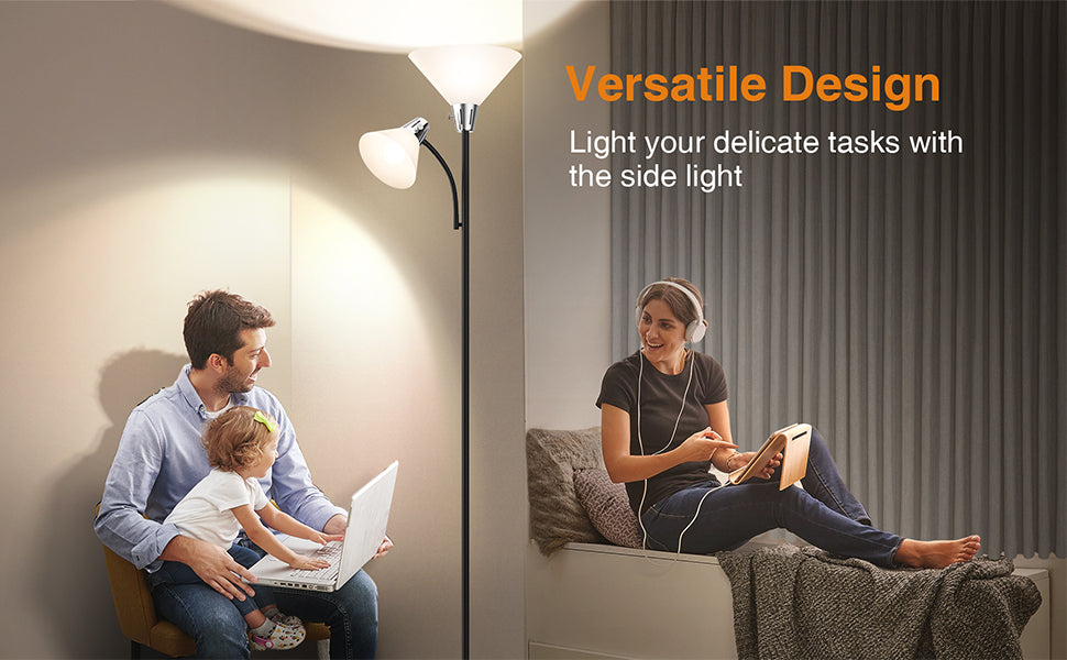 The Lepower-tec floor lamp is both good-looking and versatile. The LED floor lamp has a main top light and a side reading light, suitable for living room, bedroom, home office, and medium sized room.